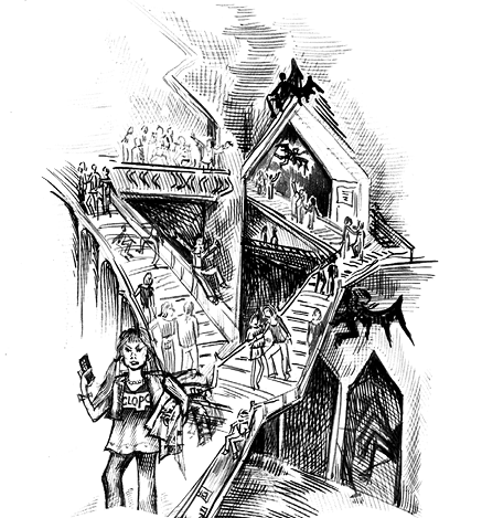 Быстро добраться не получилось. Из вестибюля до общежития был долгий путь сначала по огромной каменной спиральной лестнице, затем через чудовищно широкий коридор, который больше был похож на переулок. Старинная готика повсюду смешивалась с хайтеком: каменные вековые стены и своды коридоров были увешаны рекламными светящимися плакатами, по пути попадались вполне современные эскалаторы, как в супермаркете. Кругом была толкучка и неразбериха – курсы продирались друг через дружку, да еще и домовые путались под ногами.