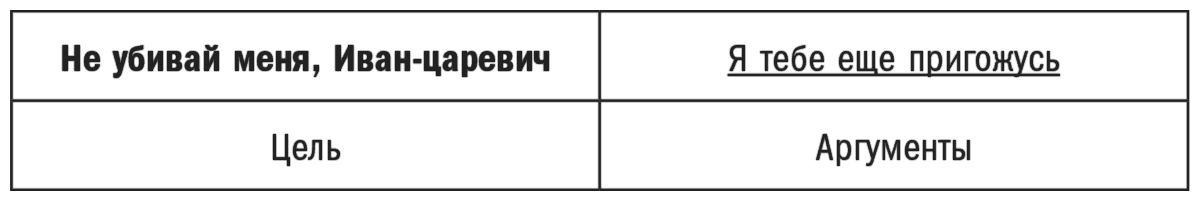 Наша универсальная формула очень четко определяет, каким «аргУментом» надо «аргументировать». Звери просят не убивать их не потому, что жить хочется или дела недоделанные остались. И не потому, что они принадлежат к редкому виду и на планете их осталось раз-два и обчелся. Они уверяют, что смогут пригодиться Ивану, то есть, говоря языком копирайтинга, продают адресату преимущества.