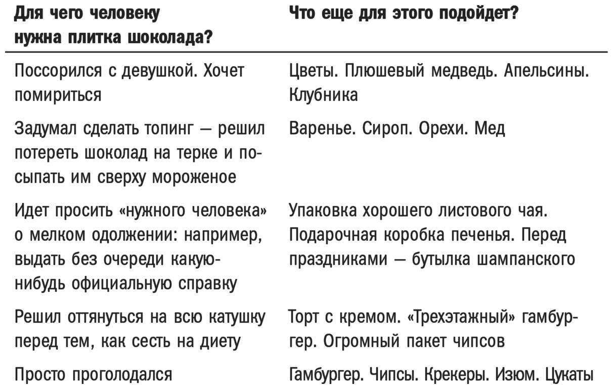 Давайте разберемся на примере. Представьте, что некий человек приходит к вам в магазин в поисках плитки шоколада. Для чего эта плитка могла бы ему понадобиться? Если вдуматься, вариантов бесчисленное множество.