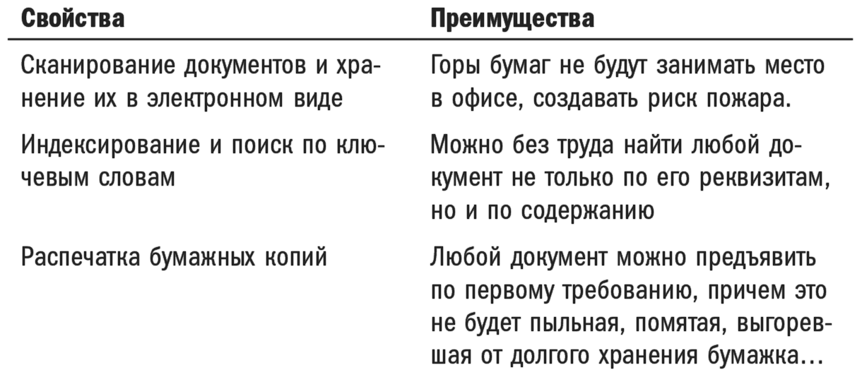 Например, рассказывая о продуктах для ведения электронного документооборота, можно взять следующие свойства и перевести их в следующие преимущества.