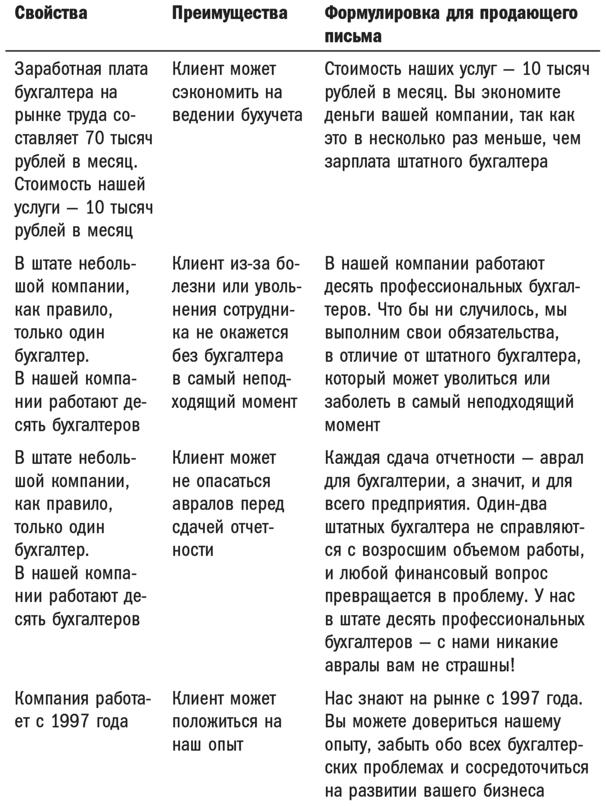 Или еще пример, снова из книги Сергея Бернадского. Представьте, что ваша компания предлагает другим предприятиям услуги по ведению бухгалтерского учета и эти услуги вы хотите продать. Вы составили список свойств, которые важно упомянуть в тексте:
