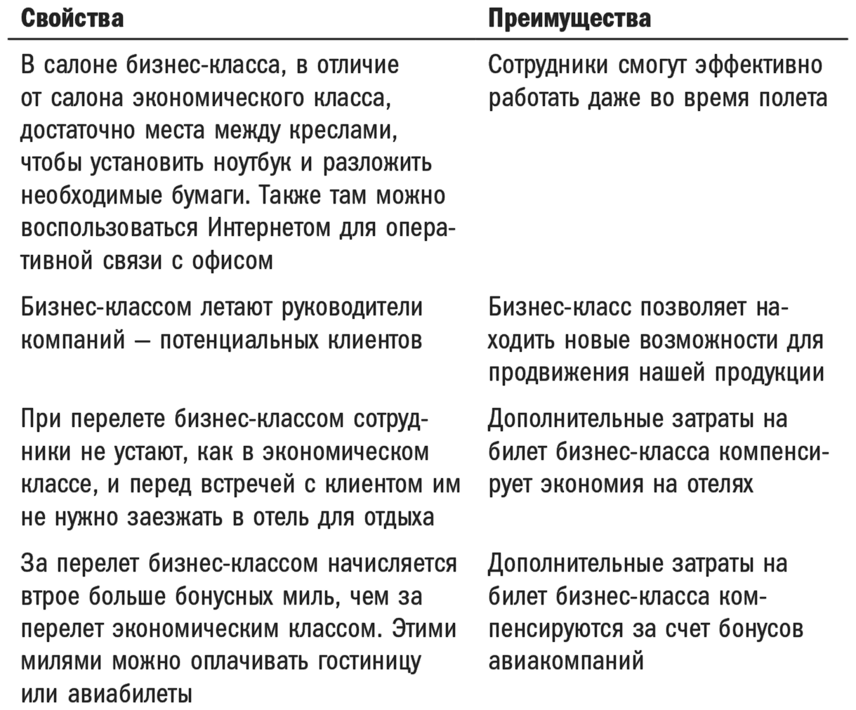 Перед вами набор свойств «эконома» и «бизнеса» и преимуществ, в которые эти свойства можно перевести.