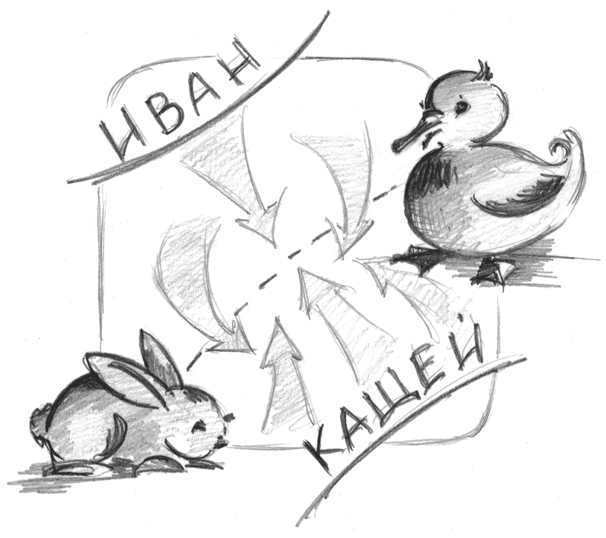 Не убивай нас, Иван-царевич! Мы тебе еще пригодимся. Ты вот идешь с Кощеем биться, а он ведь могучий колдун! Вдруг он в великана превратится или, наоборот, станет маленьким-маленьким и подкрадется к тебе незаметно? А то и вовсе взлетит и сверху на тебя накинется? Как ты один сдюжишь? Другое дело, если с тобой будет медведь – он любого великана заломает. Или заяц – он даже крошечного врага углядит. Или утка – она тебя в воздухе прикроет. Так что ты возьми нас лучше с собой, Иван-царевич. Тогда Кощею против тебя в жизни не устоять!