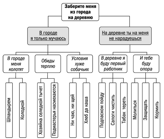 Это и есть наш «ремейк» – письмо, полностью построенное от общего к частному. Судите сами. Сначала из заглавной фразы письма мы узнаем, что Ваньку нужно забрать в деревню. Затем заглавные фразы «ветвей» объясняют почему: в городе Ванька только страдает, а в деревне станет для деда источником радости. Далее заглавные фразы абзацев сообщают, от чего именно страдает Ванька и чему будет радоваться дед. Наконец, из самих абзацев становится ясно, кто, когда и чем бил Ваньку и на каких «рабочих местах» он готов потрудиться.