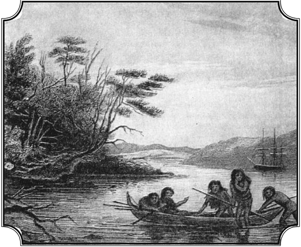 Попытки получить хоть какие-то сведения о европейских или американских поселениях, китобоях, путешественниках, миссионерах, так же, как и раньше, не дали результата. В связи с трудностями маневрирования корабля в узких проливах архипелага в условиях порывистого ветра, капитан принял решение двигаться дальше на шлюпках. Ранним утром три вельбота и один ялик с группой из двадцати восьми человек пустились в путь под руководством капитана Александра. После полудня, продвигаясь к берегу по одному из проливов, «флотилия» повстречалась с челноком, в котором находилось несколько Фуэгинов. Это были самые жалкие и убогие создания, каких только можно себе представить. В восточной части архипелага туземцы одеваются в плащи из шкур гуанако, в западной части – в тюленьи шкуры. Здесь же, у племен, живущих посередине, мужчины носят выдровую шкуру или какой-то маленький лоскуток с носовой платок, недостаточный даже, чтобы закрыть спину до поясницы. Эта накладка, стянутая тесемками, передвигается из стороны в сторону в зависимости от того, откуда дует ветер. Те Фуэгины, которых встретили наши путешественники в челноке, были совершенно нагими – и дети, и мужчины, и женщины. Шел сильный дождь, и по их телам струилась дождевая вода, смешиваясь с брызгами, срывающимися с вершин волн.