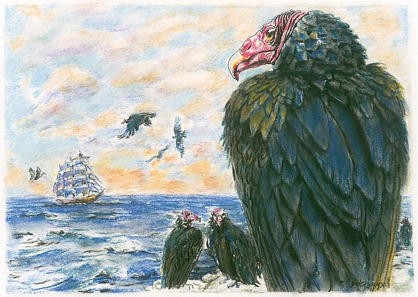 Александр взял бинокль, чтобы рассмотреть небольшой кусочек суши, к которому они приближались. Он увидел черные скалы, только лишь черные скалы. В расщелинах между ними – ни травинки, ни букашки, ни зверюшки, – всё мертво. На скалах сидели Черные птицы, одни лишь Черные птицы. Птицы заметили приближающийся корабль. Они взлетели и собрались в огромную стаю – их стая была столь велика, что закрывала собой небо. Грозной тучей устремились Черные птицы к кораблю. Капитану Александру все это решительно не понравилось.