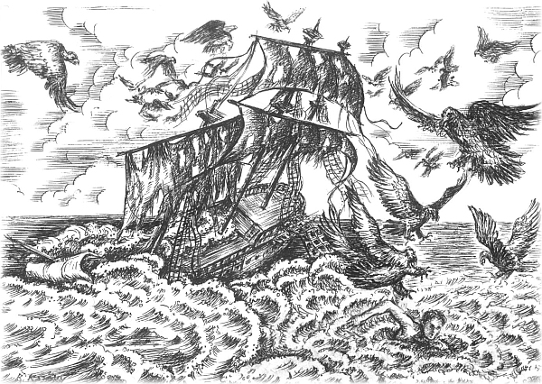 Он развернул корабль, паруса наполнились ветром. Если бы парусник сумел набрать полную скорость, которой он обычно идет, – конечно, его не догнали бы Черные птицы. Но стая была уже слишком близко. Птицы настигли его и стали перекусывать канаты и срывать паруса своими железными когтями и клювами. Паруса не выдерживали натиска Черных птиц, они рвались и не могли уже наполняться ветром так, как это было раньше. Корабль постепенно терял ход. Птицы набросились на мачты, с клекотом и визгом перегрызали вымоченную в морской воде древесину – твердую, почти как железо. С грохотом упала одна мачта, потом другая. Птицы пробили клювами борт, и в корабль хлынула вода. Александр понял, что «Быстрые паруса» обречены, ничто не сможет их спасти.