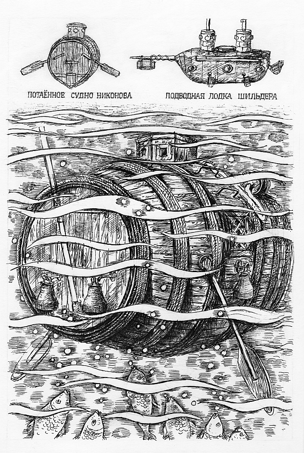 – Да, ещё при Петре I была построена первая подводная лодка, потаённое судно Никонова, – она была совсем маленькая, на двух гребцов, и погружалась очень неглубоко. Во времена капитана Александра уже были построены и испытаны небольшие подводные лодки с несколькими гребцами – Корнелиуса в Лондоне и Шильдера в Петербурге.