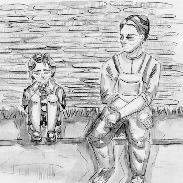 его дочка, усевшись на холодные плиты тротуара, внимательно рассматривала какой-то странный сероватый камень в своих пухленьких ручках, поворачивая его из стороны в сторону.