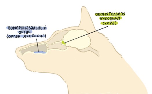 На нёбе у собаки расположен вомероназальный орган. Он ещё называется «орган Якобсона». Это часть обонятельной системы, которая помогает собакам чувствовать некоторые запахи через пасть. Этим органом собаки улавливают феромоны и получают информацию через оставленные метки.