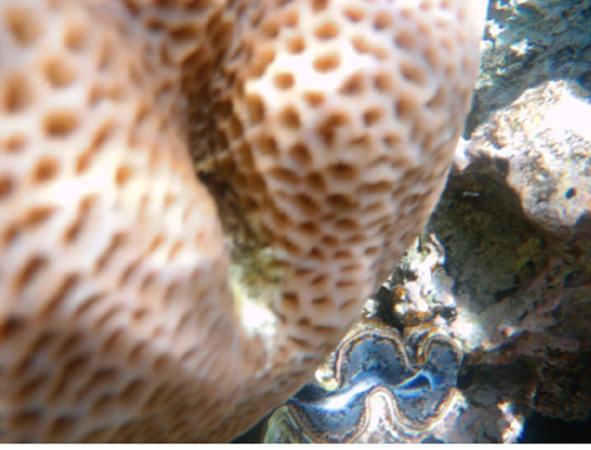 Здесь в кораллах обитают агрессивные рыбки тёмного цвета (названия их я не знаю), размером с ладонь, но такие злые, что когда я их фотографировал, они ёжились всеми своими плавниками, особенно спинным и с разбегу нападали на камеру, ударяясь прям в объектив. Их в данном коралле живёт несколько особей и все по очереди на меня нападали. И так было несколько дней подряд, когда я мимо проплывал. Может быть, таким образом охраняют выложенную в кораллах икру? Хорошо ещё, что они маленькие и своей неуёмной агрессивностью меня только тешили. Я представляю, что было бы, если это были бы большие рыбины!!!