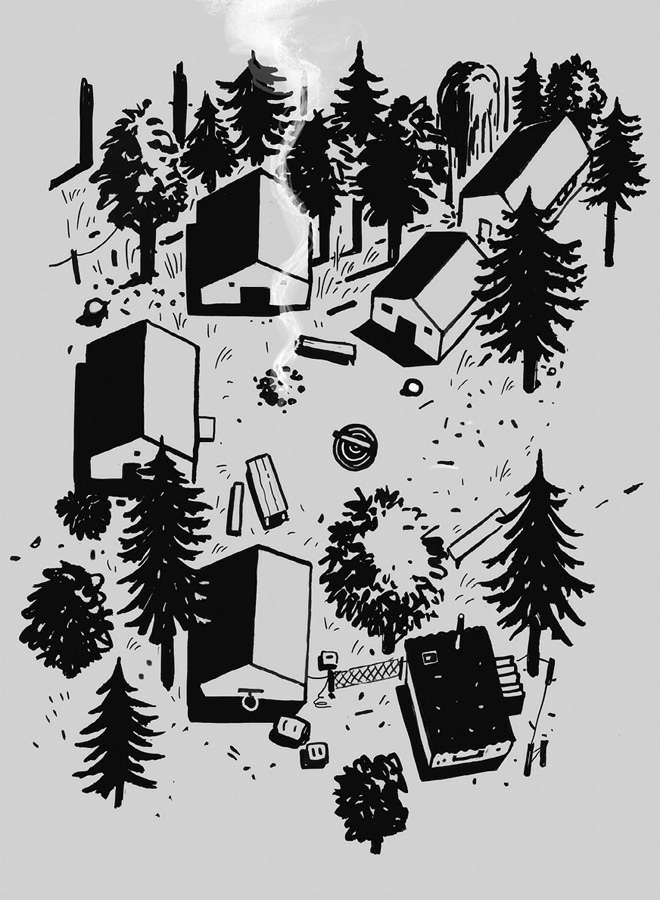 Поляну из лесного рекламного проспекта не узнать. Трава гораздо выше, чем на фотографиях, – я уже слышу, как клещи цокают языками. Бревенчатые хижины впали в полудрему – они нам не очень-то рады и вообще не хотят никому служить жильем. Выцветшая древесина, пыльные окна, уныло свисают нити паутины. Завидев нас, хижины закатывают глаза.