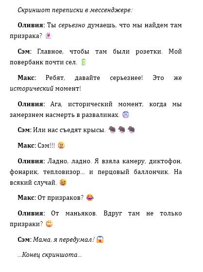 Особенно после того, как Оливия рассказала про эти странные записи в архиве и про книгу, которая сама текст меняет. Вот это уже реально крипово. Я, конечно, люблю ужастики и всякую мистику, но чтоб такое в жизни… Это уже перебор, по-моему. Хотя, если честно, звучит как начало крутого квеста! Типа, «Охотники за привидениями» в Сайлент-Крике. Я бы даже стрим по этому поводу запилил, если б не… ну, вы поняли. Привидения и все такое. Вдруг они кусаются?