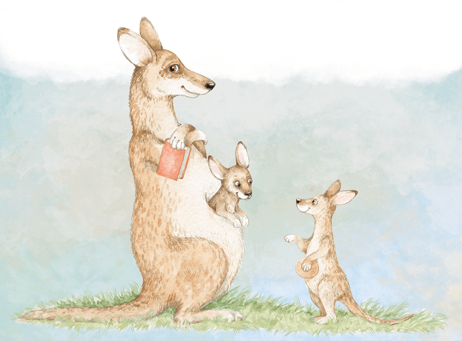 Однажды на лужайке маленькая кенгуру вылезла из маминой сумочки и играла с такими же малышами, как сама. Они рвали цветочки, копали лапками тоннели и бегали наперегонки.