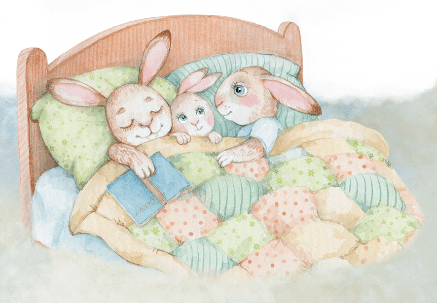 В заячьей семье счастье – у мамы с папой родился маленький зайчонок. Он абсолютно весь белый и пушистый, только на ушке маленькое чёрное пятнышко в виде сердечка. Своими чёрными глазками-бусинками он любопытно рассматривает норку и смешно морщит носик. Как будто собирается чихнуть. Мама с папой ухаживают за ним, кормят, поят, переодевают и купают.
