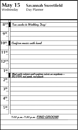 Striding through her office suite, Savannah took advantage of the calm before the storm that was often her day to review her recorded checklist. She marched through the private reception area appointed by her favorite designers, ignoring the deliberately impressive sweep of the city outside the conference room’s windows as she finalized the status of each detail with every exact step. She might have been stepping in high cotton by the time she arrived at her private office. She clicked off the recorder, the decisive sound making her smile. No, not one thing would go wrong with this wedding. She pushed open her office door, thoroughly triumphant.