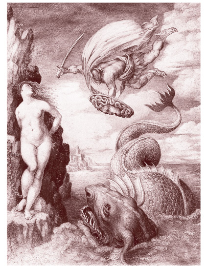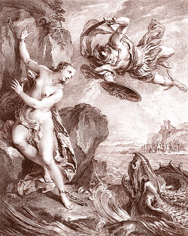 Персей спасает Андромеду от морского дракона на гравюре Л. Карса, 1728 г.