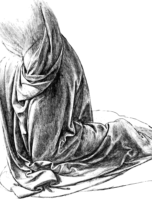 Рисунок, находящийся в коллекции Бонна (Bonnat), дает нам первоначальный замысел Леонардо[11]. После выбора сюжета, когда план работы сложился в его уме, он взялся за перо и набросал первый очерк сцены, которую намеревался рисовать. Богородица стоит на коленях в позе поклонения: Иисус лежит перед ней на земле; маленький св. Иоанн, нагой, наклоняется к нему, отдавшись созерцанию. С каждой стороны этой центральной группы – волхвы и пастухи (четверо с левой стороны, трое – с правой). Этот наскоро сделанный набросок является как бы первым проблеском образов в уме великого художника: ничего традиционного или заимствованного; нет ни религиозного символизма, ни торжественных поз, нет условного и симметрического расположения фигур. Позы естественны и правдивы: один наклоняется над плечом своего товарища, стоящего с опущенной головой и скрещенными руками; другой держит руку перед своими глазами, чтобы лучше видеть; старик сидит, опираясь подбородком на свой страннический посох, и пристально смотрит. Вся группа точно выхвачена из жизни. Эта религиозная тема прежде всего вызывает в уме Леонардо реальную сцену; в ней участвуют живые люди, похожие на тех, среди которых он ежедневно толкался на улицах Флоренции.