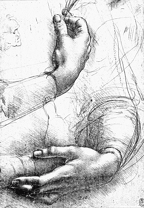 Вы живо постигаете дух работы Винчи: он идет от души к телу, от внутреннего к внешнему; он представляет себе чувства, а затем уже их выражает в жестах и в чертах лица. Настойчиво занимаясь душевными движениями, он их точно определяет, отыскивает разнообразные их оттенки, но как живописец он не отделяет их от сопровождающего их движения; он видит, как они выражаются в теле, которое они возбуждают, и из всего этого извлекает трогательные черты этого трепетания душевной жизни. Мы обладаем еще кроме этих и несколькими другими рисунками отдельных лиц (Лувр, Британский музей) и побочных сцен, которыми фантазия художника щедро наделяет фон своей картины (Уффици, рисунок развалин). Надо заметить, что большей частью этих рисунков он не воспользовался при окончательной компоновке картины. Из этого не следует, что у Леонардо было недостаточно фантазии, но то, что удовлетворяет других, не удовлетворяло его, он все оставался недовольным; идеальное совершенство, жившее в его мечтах, заставляло его делать все новые и новые попытки и слишком часто доводило его до отчаяния.