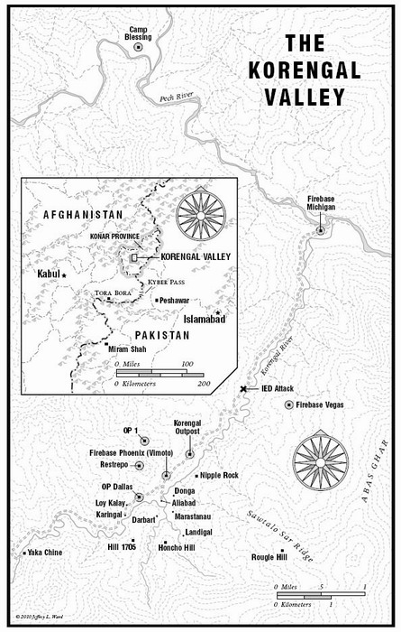 THIS BOOK WAS THE RESULT OF FIVE TRIPS TO THE Korengal Valley in eastern Afghanistan that I took between June 2007 and June 2008 for Vanity Fair magazine. I was an “embedded” reporter and entirely dependent on the U.S. military for food, shelter, security, and transportation. That said, I was never asked—directly or indirectly—to alter my reporting in any way or to show the contents of my notebooks or my cameras. I worked with a photojournalist named Tim Hetherington, who also made five trips to the Korengal, sometimes with me and sometimes on his own. Our longest trips lasted a month. Tim and I shot roughly 150 hours of videotape, and that material was aired in brief form on ABC News and then became the basis of a featurelength documentary, produced and directed by Tim and me, called Restrepo.
