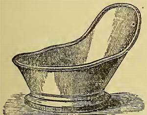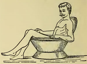 1. Холодная сидячая ваннаХолодная сидячая ванна принимается следующим образом. Сосуд, специально изготовленный для этих ванн (рис. 2), или, если его нет, широкий, но не глубокий сосуд из дерева, олова или цинка (рис. 3) наполняется холодной водой на четвертую или пятую часть. Больной садится в эту ванну раздетым, как на стул, нижняя часть тела до почек и верхняя часть ног находится в воде (рис. 4). Полностью раздеваться не обязательно. Эту ванну следует принимать от половины минуты до трех минут.