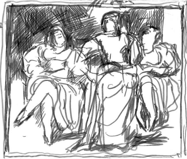 Вера сидела незаметная у раскрытого окна кухни, и часами рисовала этих девочек в черных сетчатых чулках, в париках, натянутых на распаренные от жары лбы, ловила кончиком карандаша движения пухлых рук, несущих к губам сигарету, плавные тягучие линии шеи, щедрые овалы бедер, мечтательные и быстрые глаза в разноцветных озерах косметических теней, и никак не могла оторваться от зрелища волнующего и выставленного напоказ чувственного естества.