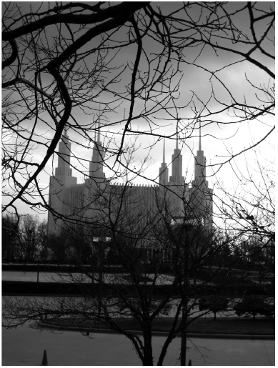 Вот мормонский храм. В мрачноватую погоду. Вообще, храм веселее. Похож на взволнованного дикобраза. Вход на территорию открыт, цветов много.