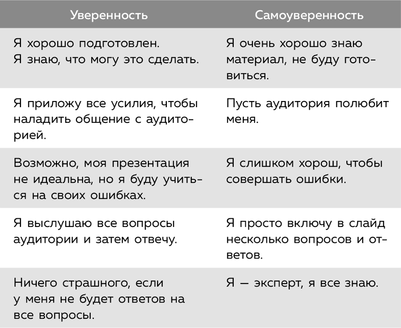 Давайте посмотрим на это в действии. Представьте, что вам нужно провести презентацию. В таблице ниже мы можем видеть разницу между уверенностью и самоуверенностью.