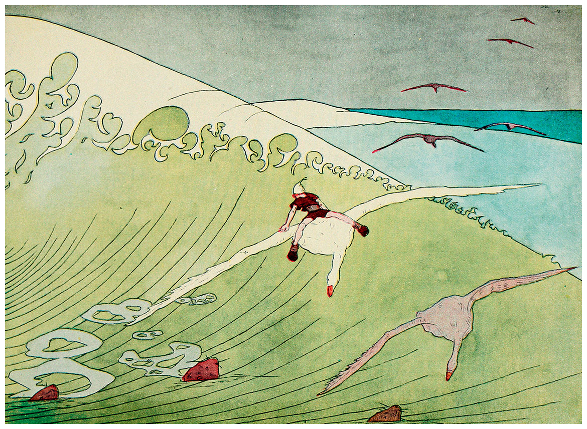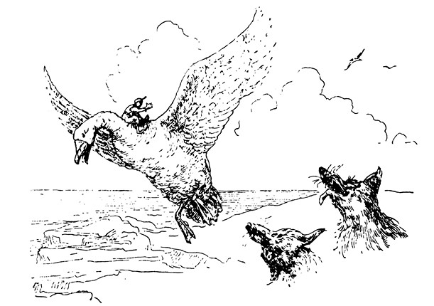 Белый гусак вёл себя так беззаботно, словно никакой опасности и в помине не было, – не глядя по сторонам, он спокойно пощипывал травку. Мальчик, вытянувшись во весь рост, лежал на его спине и безмятежно глядел в синее небо. Он был уже таким умелым наездником, что без труда стоял и лежал на гусиной спине.