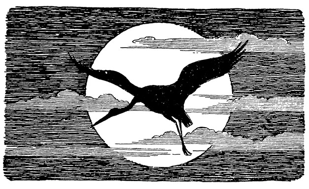 Вскоре раздумья Нильса были прерваны необыкновенно красивым зрелищем. Высоко в небе плыла луна, полная, круглая, а рядом, чуть опережая её, летел большой аист. Он появился неожиданно, словно вынырнув из самой луны. Под светлым куполом неба аист казался чёрным, а его распластанные крылья будто касались краёв луны. Нильс отчётливо, словно на рисунке, видел его небольшое туловище, вытянутую узкую шею, свисавшие вниз длинные тонкие ноги. «Да ведь это господин Эрменрих!» – узнал аиста мальчик.