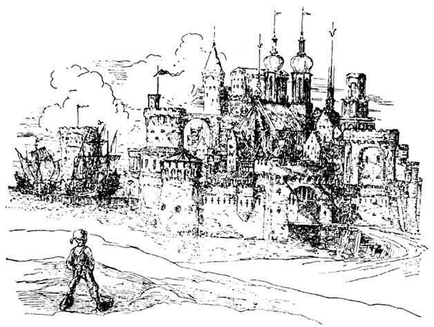 Обуреваемый желанием узнать, какие диковины скрываются за великолепной стеной, он вошёл в ворота. Под аркой сидели сторожевые, разодетые в пёстрые платья с буфами на рукавах, и, отставив алебарды, играли в кости. Они так увлеклись игрой, что не обратили внимания на мальчика, поспешно проскользнувшего мимо.