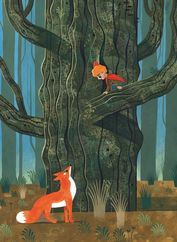 Вдруг мальчик увидел молодой бук. Он выпустил лисий хвост и поспешно влез на дерево. Однако Смирре в пылу увлечения не заметил этого и ещё долго кружился за собственным хвостом.