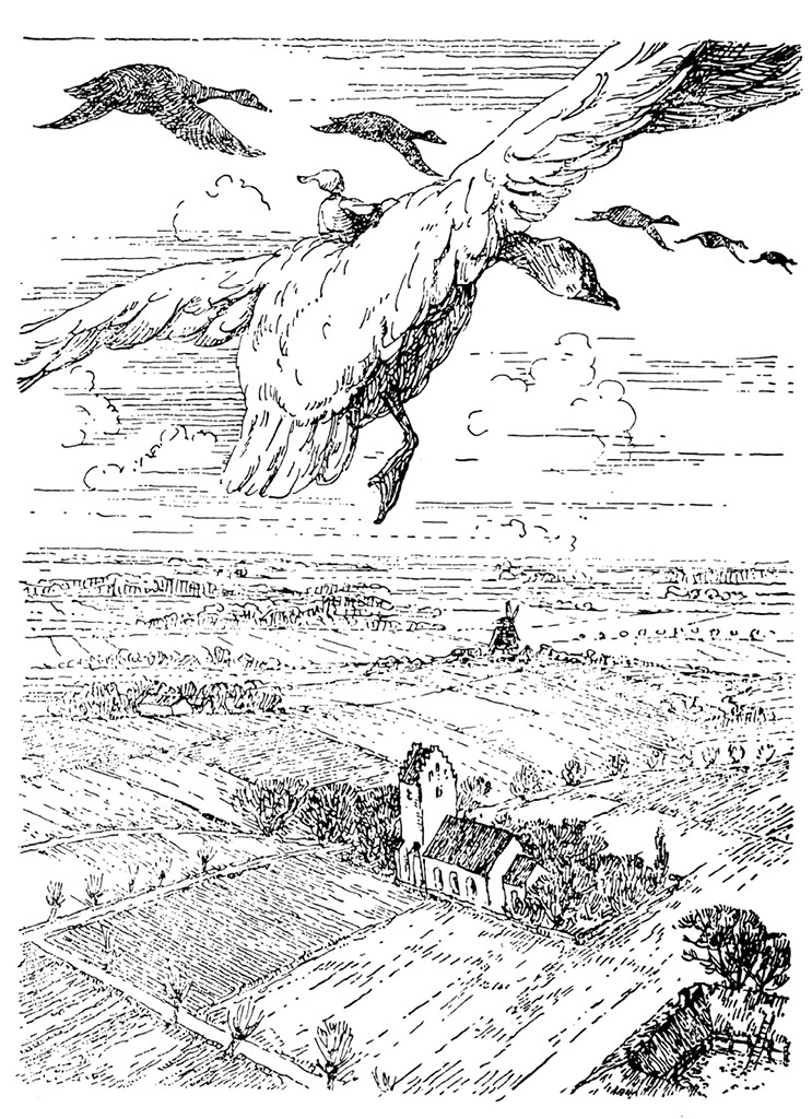 Но тут мальчик заметил: гуси уже не летели вперёд по прямой, а всё кружились и кружились над всей равниной Сёдерслетт, словно радуясь, что снова вернулись в Сконе и могут поприветствовать каждую усадьбу.