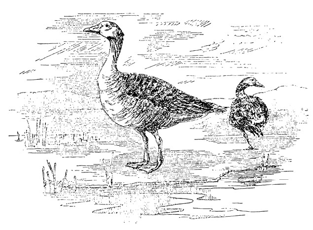 Когда дикие гуси, летевшие в хвосте, заметили, что домашний гусь не в силах поспеть за ними, они стали кричать гусыне-предводительнице: