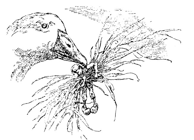 Когда Нильс набрал полную охапку сухой осоки, гусак, схватив его за ворот рубашки, перенёс вместе с травой на льдину. Дикие гуси уже спали там стоя, спрятав клюв под крыло.