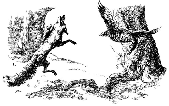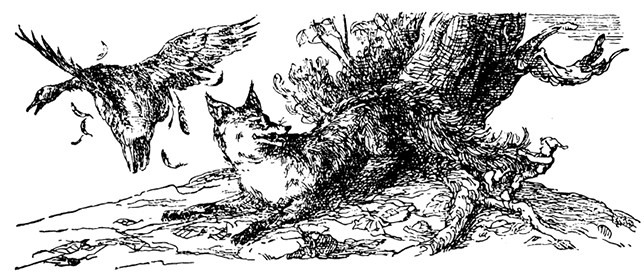 Тут-то Смирре сообразил – ведь его преследователь совсем неопасен! Лис остановился, положил гусыню на землю, придавив её передними лапами, и уже раскрыл было пасть, чтобы перегрызть ей горло… Но внезапно передумал – ему захотелось подразнить этого малыша, который гнался за ним.