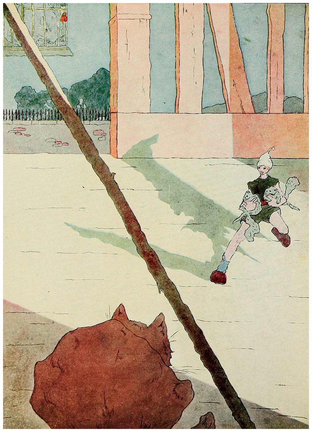 Домовой тем временем уже бежал по мощённому камнем двору прямо к беличьей клетке. Но клетка висела высоко, дотянуться до неё он не смог и пошёл к сараю, где хранилась рыболовная снасть. Взяв удилище, он прислонил его к клетке и в один момент взлетел по нему вверх – прямо как заправский моряк по канату. Очутившись у клетки, он стал трясти дверцу зелёного домика, чтобы отворить её. Старая хозяйка спокойно сидела на своём месте: она знала, что дети заперли дверцу на висячий замок из боязни, как бы соседские мальчишки не украли белочку. Малыш и в самом деле не смог отворить дверцу клетки. Тогда белка вскочила на проволочное колесо и долго что-то говорила домовому. Выслушав пленницу, он съехал по удилищу вниз на землю и выбежал из ворот усадьбы.