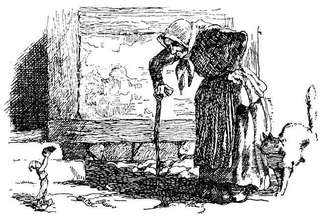 Тут уж старая хозяйка не могла усидеть в горнице. Она поднялась, вышла на двор и тихонько притаилась в тени насоса. Только в засаде она была не одна: кое-кто, также заметив малыша, сгорал от любопытства. То была домашняя кошка. Осторожно подкравшись, она прижалась к стене дома в нескольких шагах от яркой полоски света. Немало времени провели старушка и кошка в ожидании этой холодной мартовской ночью. Старушка начала было подумывать, не пойти ли ей обратно в горницу, как вдруг услыхала стук деревянных башмачков по мощёному двору. Она увидала, что малыш-домовой, как и прежде, что-то несёт и это что-то пищит и барахтается у него в руках. И тут старую хозяйку осенило: домовой-то бегал в орешник за детёнышами бельчихи и принёс их ей, чтобы они не подохли с голоду.