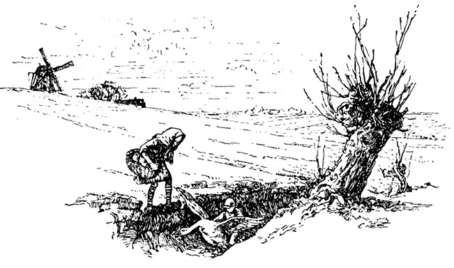 А они тем временем свернули с межи, пересекли поле и уже подходили к гусаку. Когда он наконец поднял голову, дети были совсем рядом. Ошарашенный, сбитый с толку, гусак совсем позабыл, что умеет летать, и стал поспешно спасаться бегством. Дети помчались за ним, загнали в канаву и там схватили. Старший, сунув его под мышку, понёс в усадьбу.