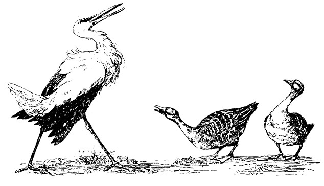 Аист всё сетовал и сетовал, а Акка, дикая гусыня, не имевшая на всём белом свете ни кола ни двора, невольно думала: «Мне бы ваши заботы, господин Эрменрих, уж я из одной гордости не стала бы жаловаться! Вы, оставаясь диким и вольным, всё же в милости у людей. Никому и в голову не придёт пустить в вас пулю или украсть хотя бы одно яйцо из вашего гнезда». Но все эти мысли она оставила при себе, а аисту лишь сказала: