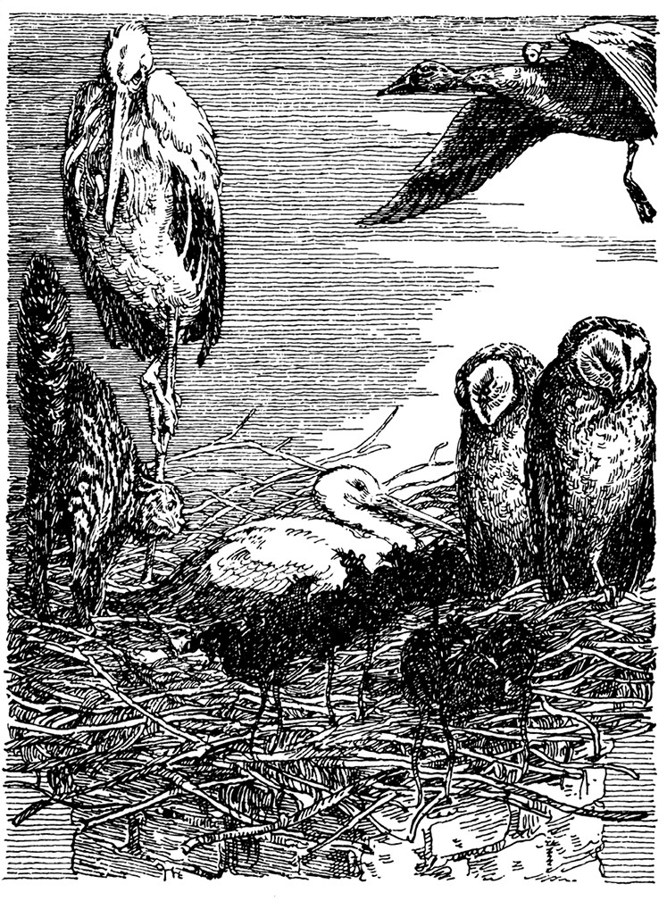 Увидев мальчика, аист встрепенулся, и в его горле что-то забулькало, словно ему стало смешно. С молниеносной быстротой он опустил клюв и, схватив Нильса, подбросил его на несколько аршин в воздух. Семь раз повторил он свою проделку, невзирая на испуганные крики мальчика и возгласы гусей: