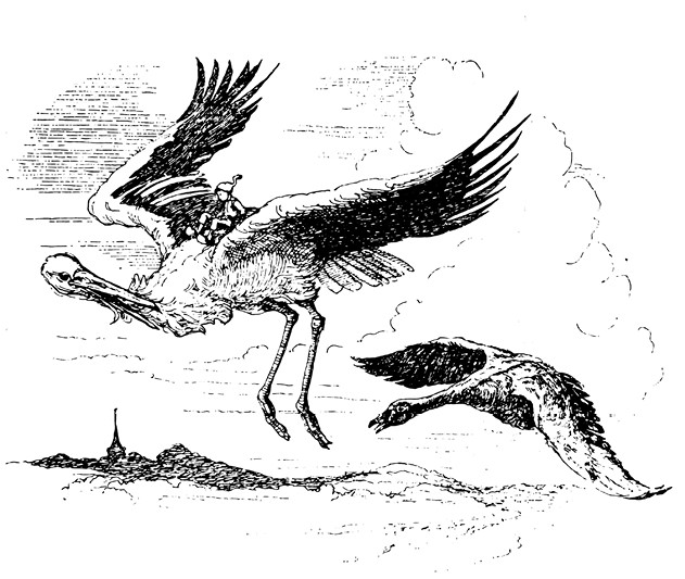 Теперь Нильс твёрдо решил улучить минутку и упросить Акку взять его на гору Куллаберг. Но поговорить с гусыней ему снова не удалось – посреди гусиной стаи вдруг шумно опустился большой аист.