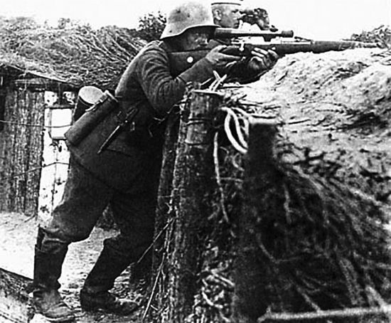 Первыми стали использовать снайперов немецкие войска. Еще в начале XX века в германской армии были созданы группы унтер-офицеров, которые тренировались в искусстве быстрой и точной стрельбы, учились маскироваться и вести скрытное наблюдение. В германских войсках уже к концу первого года войны было более 20 000 снайперских винтовок. Имея до шести снайперов на роту, немцы обладали большим преимуществом в позиционной войне.