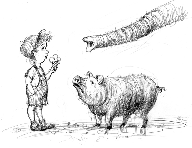 Но найти папу сразу не удалось, и мама чуть не оторвала мальчику руку в процессе быстрого передвижения по аллейкам, посыпанным мелким хрустящим ракушечником. Папа обнаружился на белой скамейке, в некотором удалении от слона. Он сидел рядом с какой-то незнакомой тётей, и они ели пломбир. Причём тётя, видимо, была незнакомой только для мальчика, потому что папа с ней разговаривал очень оживлённо. Но, когда мама с мальчиком подошли поближе, папа не стал больше продолжать разговор, вскочил и направился к ним навстречу. А мама почему-то стала говорить с папой шипящим голосом, наверно, изображала змею, которую они перед этим видели в серпентарии. И рассказывала она ему совсем не про слона, а про какую-то грязную свинью. И так всю дорогу домой. Мальчик хотел всё-таки выяснить подробности про слона, но мама с папой были так заняты обсуждением этой свиньи, что ему и слова вставить не дали.