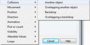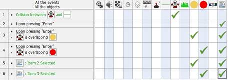 Копируем второе условие и создаём третье. Ведь если мы нажали Enter и в это время герой перекрывает объект, его нужно добавить в наше меню. Так мы и поступим: кликаем на Upon pressing “Enter” – Insert – Hero – Collision – Overlapping another object – Item 1 (жёлтый круг). Далее кликаем на столбец Popup menu – Add item.