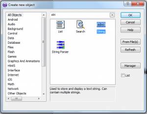 Как обычно, создадим новый документ, дважды кликнем левой кнопкой мыши по появившемуся окну и найдём текстовый объект «String». Чтобы его найти быстрее, достаточно ввести начальные буквы в строке поиска.