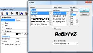 Но мы идём дальше в текстовые опции и изменяем тип и размер шрифта. Например, выберем шрифт Tarzan 24-го размера.