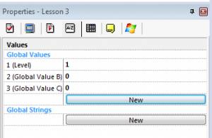 Теперь поговорим о переменной, которая будет иметь значение текущего уровня. Во-первых, для нашей задачи мы можем использовать глобальные переменные. Они расположены во вкладке «Values» свойств нашего документа (не фрейма!).