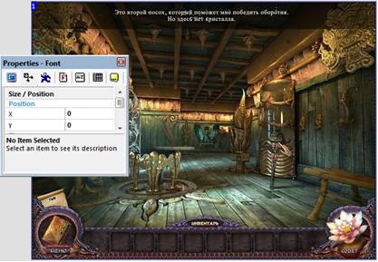Загрузим заранее приготовленную картинку с пустыми окнами для предметов и два предмета. В данном примере использовалось изображение игры «Secrets of the Dark: Eclipse Mountain», взятое с сайта www.metacritic.com. Давайте узнаем размер картинки, создадим экран такого же размера (для картинки ниже это Frame 1 – Settings – 560 x 420), а саму картинку установим в координаты 0:0, то есть она должна полностью совпасть с экраном.