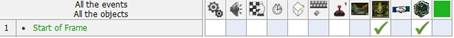 Создаём первое условие: New condition – Storyboard controls – Start of frame, в столбцах Item 1 и Item 2 выбираем Movement – Stop. Так при старте фрейма мы останавливаем наши объекты, так как изначально скорость движения у них указана 60 (в настройках типа перемещения).